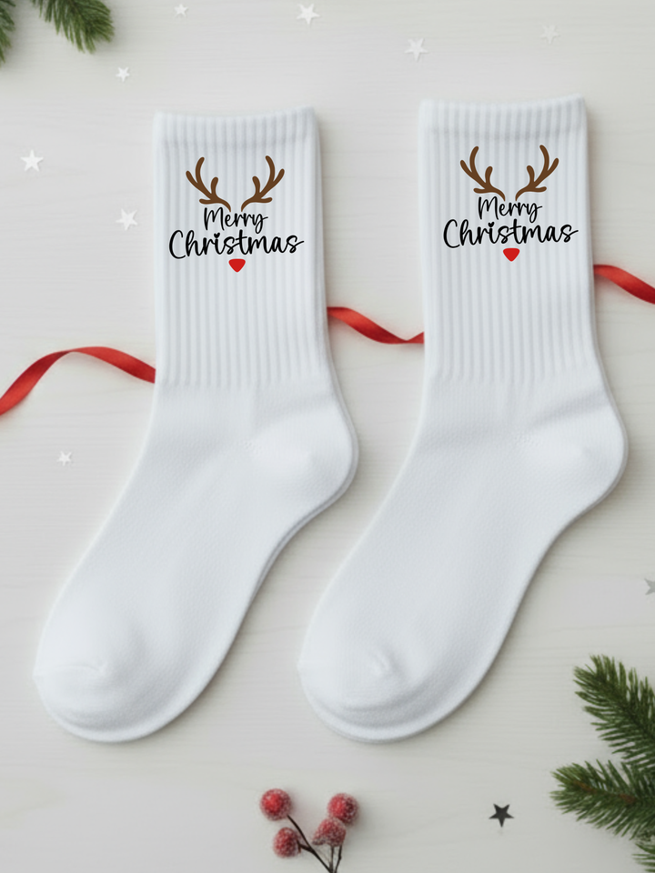 Mach deine Füße weihnachtstauglich! Unsere hochwertigen weißen Tennissocken aus 100% Bio-Baumwolle überzeugen durch Atmungsaktivität, Strapazierfähigkeit und einen coolen Merry-Christmas-Print 🎄 – perfekt für die festliche Saison oder als originelles Geschenk 🎁.