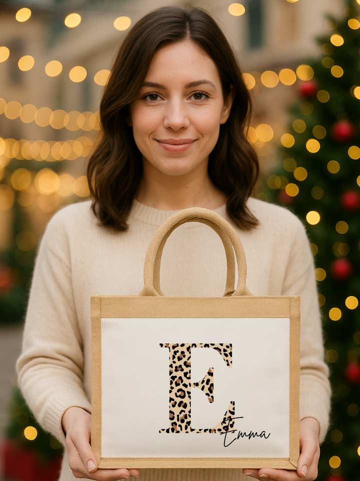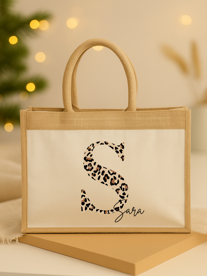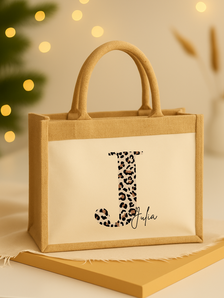 Verschenke etwas ganz Besonderes – unsere stilvolle Jute-Tasche wird mit deinem Wunschbuchstaben im trendigen Leo-Design sowie mit deinem Wunschnamen individuell veredelt.