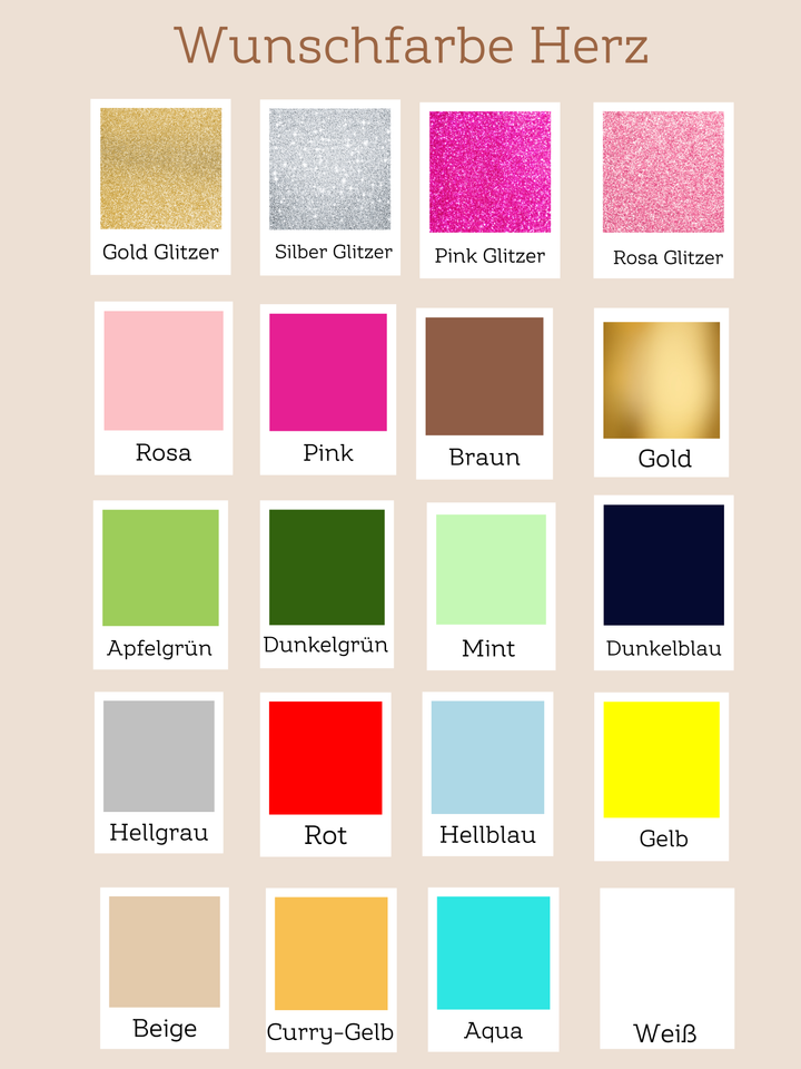 - Bitte nenne uns in der Personalisierungsbox deinen Wunschnamen und die Wunschfarbe vom Herz (siehe Bilder)