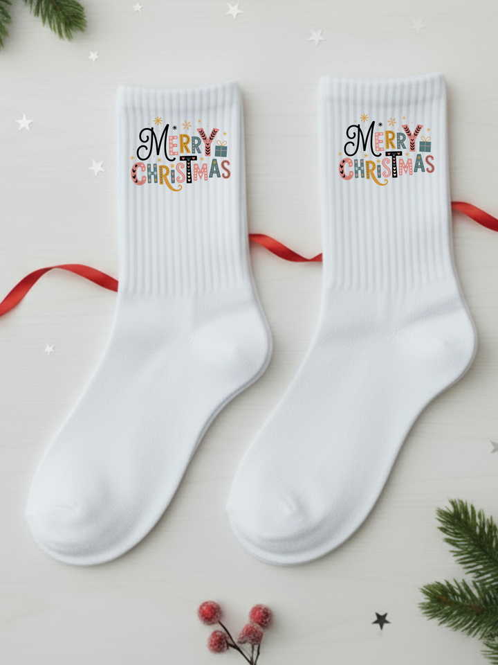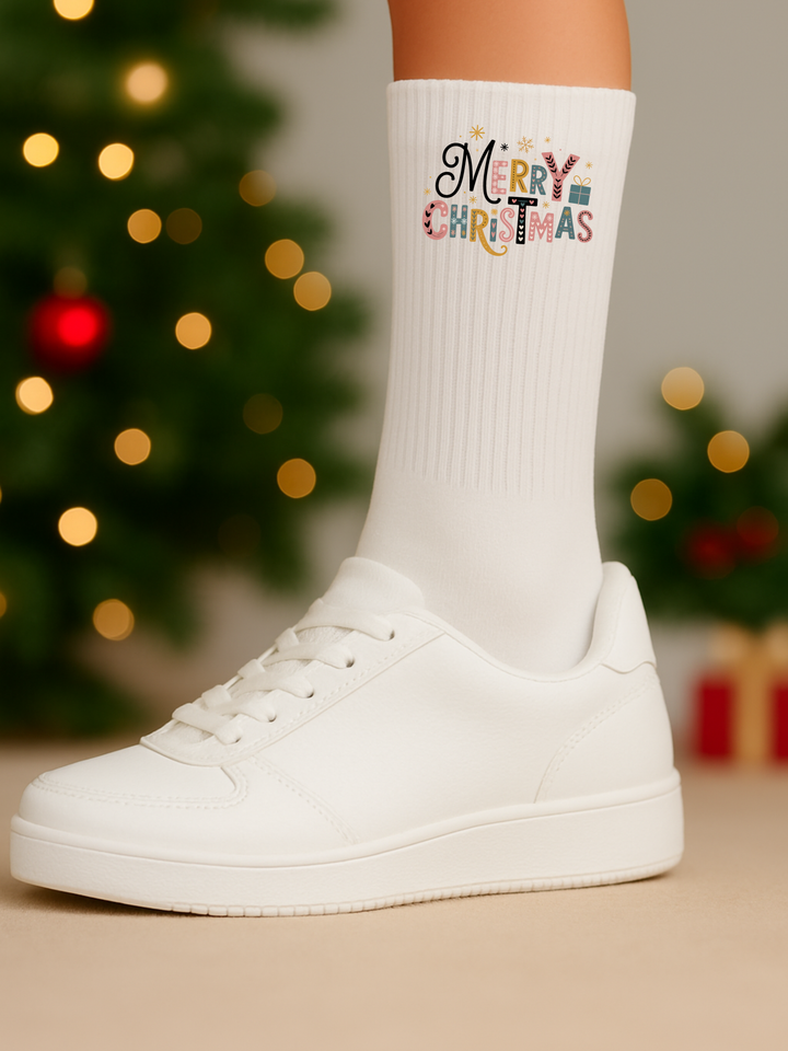 Mach deine Füße weihnachtstauglich! Unsere hochwertigen weißen Tennissocken aus 100% Bio-Baumwolle überzeugen durch Atmungsaktivität, Strapazierfähigkeit und einen coolen Merry Christmas Motiv 🎄 – perfekt für die festliche Saison oder als originelles Geschenk 🎁.