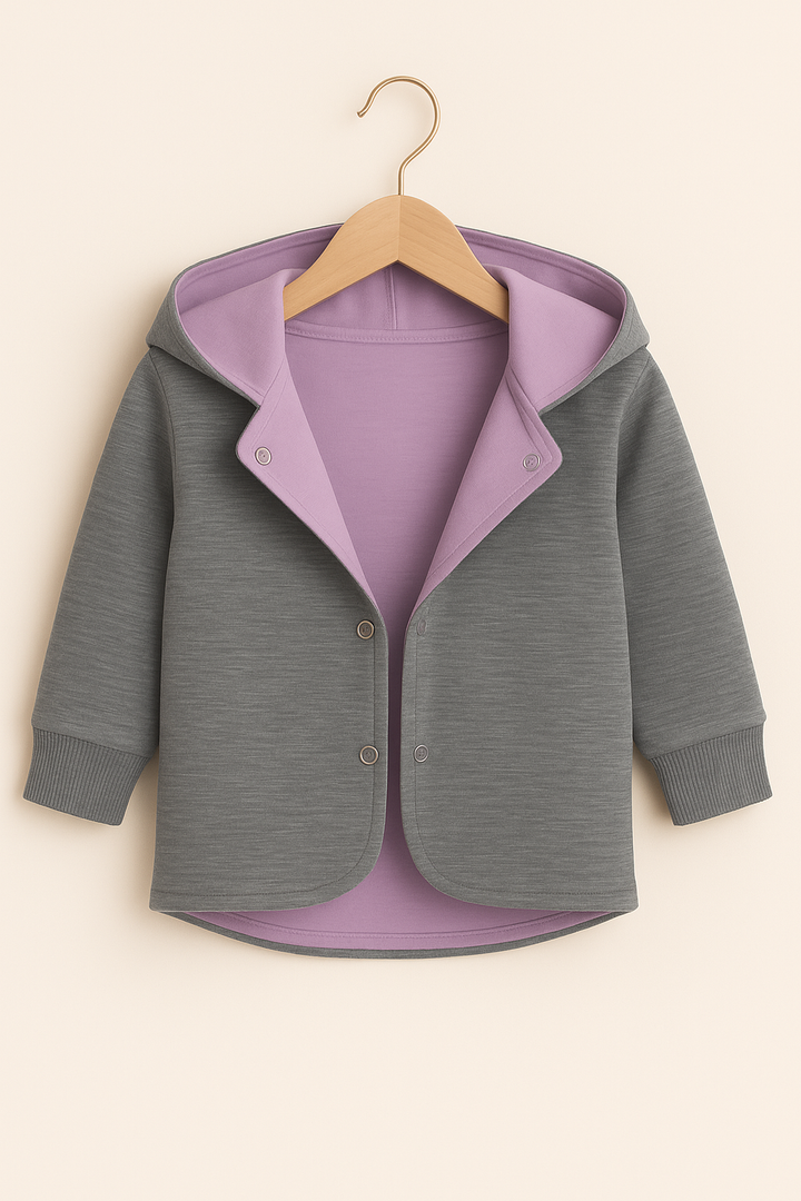 Unsere bequeme Wendejacke in Flieder/Hellgrau ist ein Must-have für kleine und große Entdecker! 🌿✨